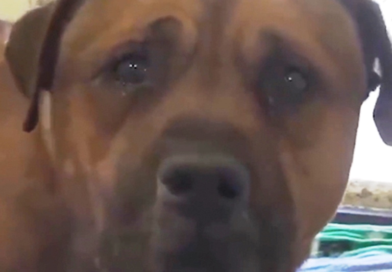 Aj’s lovely eyes brimmed with tears as his face contorted with agitation and stress. Workers in the shelter tried to comfort the poor dog.