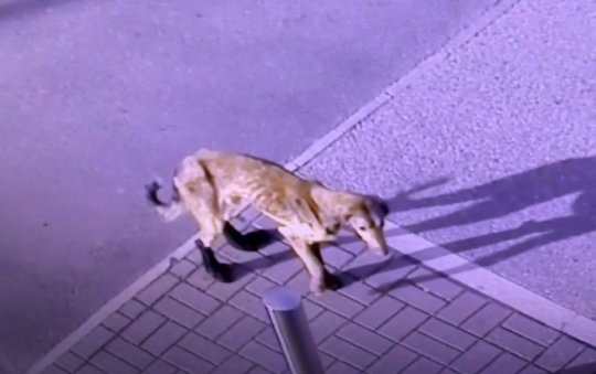Watch the injured dog wandering into a garage forecourt
