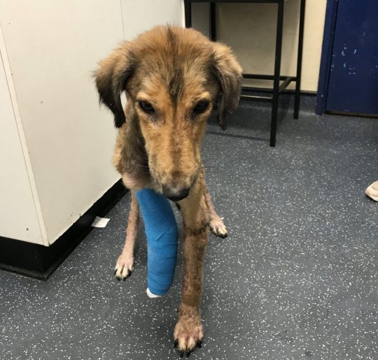 “The poor girl is suffering from both sarcoptic mange and ringworm and was also emaciated. She was in a terribly sad state. She had to be sedated to get the socks off her.”