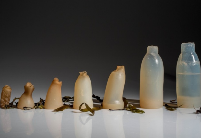 These bottles are made of powdered agar and water. Its feature is that it will keep its shape until it is filled with water, and will decompose as soon as it is emptied. One can even eat the container.