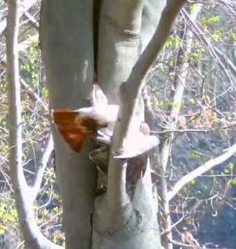 The hawk somehow got his leg stuck in the tree, and it tried to escape but couldn’t. After several attempts, the bird was exhausted and couldn’t escape.