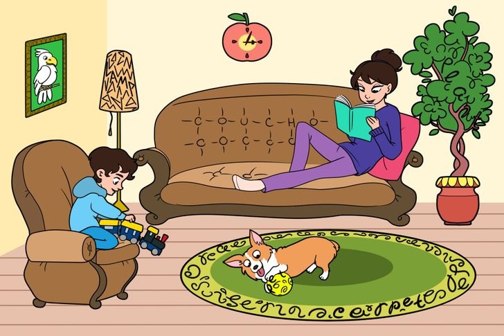 Can you find the hidden words? If you’re still looking for them, this might help. The words you need to find include carpet, pet, lamp, couch, and plant. All of these things can also be spotted in the picture along with the hidden words!