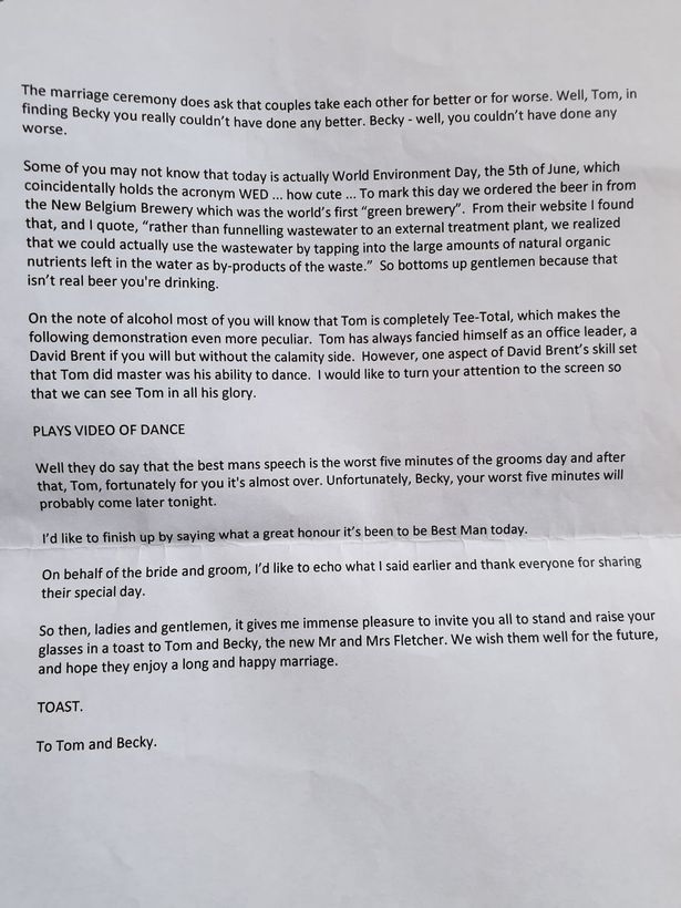 The best man even compared the groom’s dancing skills to those of David Brent from The Office. The speech has several hilarious jokes before ending on a happy note.