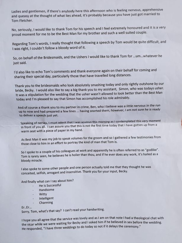 The speech starts with: “If there’s anybody here this afternoon who is feeling, nervous, apprehensive and queasy at the thought of what lies ahead, it’s probably because you have just got married to Tom Fletcher.”