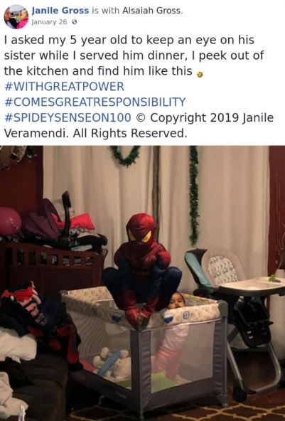 #1 “I asked my 5 year old to keep an eye on his sister while I served him dinner, I peek out of the kitchen and find him like this.”