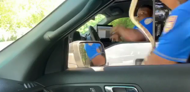 The police officer brought a fake snake during the daylight to scare off his partner and have a good laugh about it.