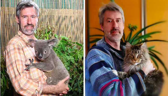 The first post is of Liudas, where one picture is from 2018, where he was holding a koala in 2018. On the right, he is holding his pet Maine Coon Ceslovas inside his home.