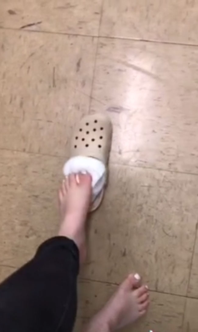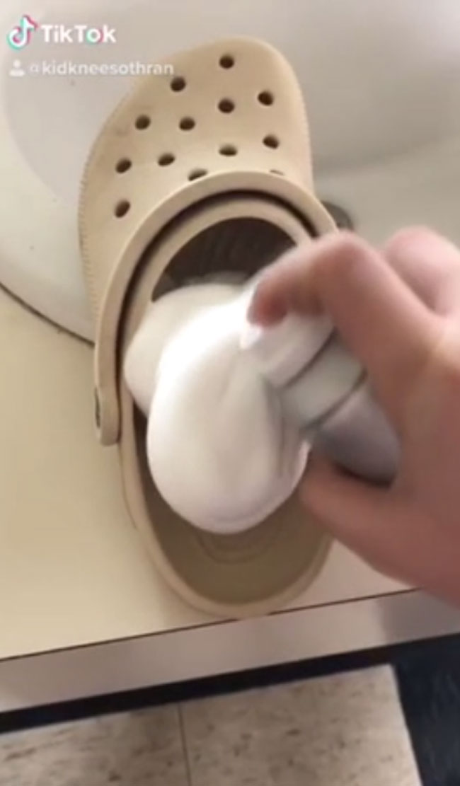 A video which was filmed in Point Lookout, Missouri shows a man filling his croc shoe with shaving cream and stepping into it.
