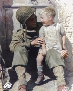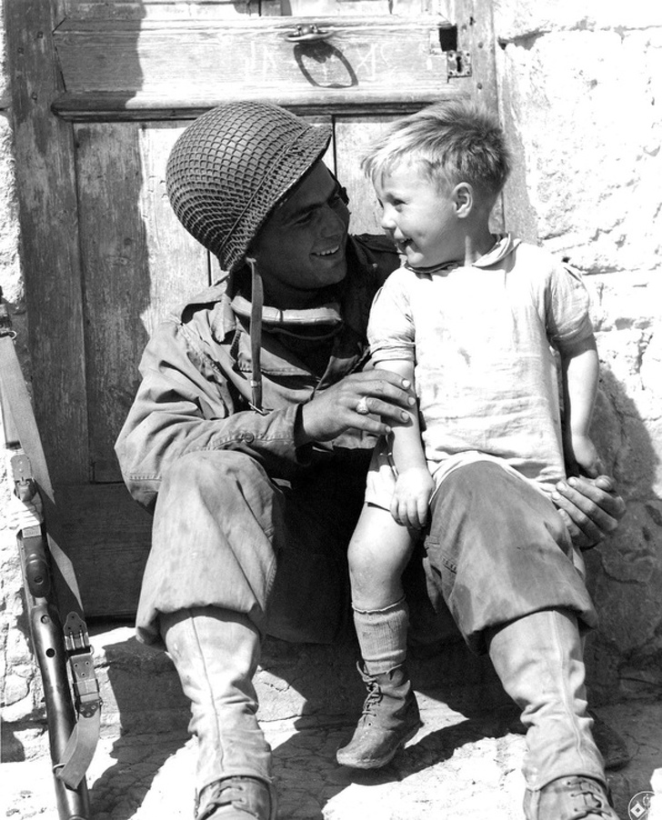 #3. U.S. Army Pfc. Fred Linden holding a young French boy following the liberation of the village of Trévières during the Battle of Normandy on June 10, 1944