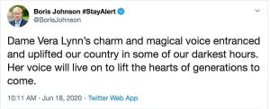 Prime Minister Boris Johnson paid tribute to Dame Vera, saying her ‘charm and magical voice entranced and uplifted our country in some of our darkest hours. Her voice will live on to lift the hearts of generations to come’.