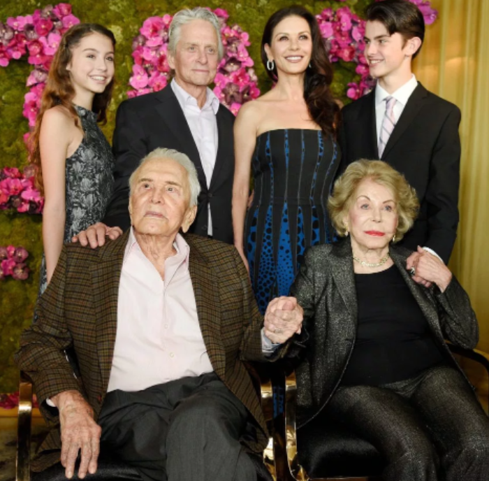 Michael Douglas was seen beaming proudly over his Hollywood family spanning over a hundred years in age in this picture.