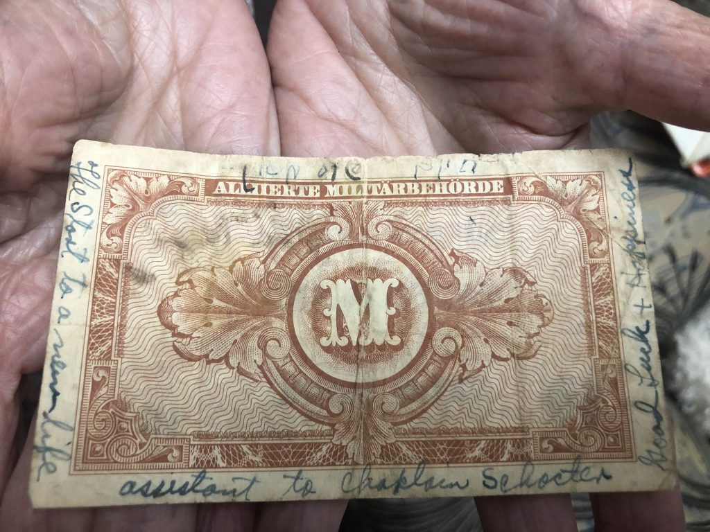 Ebert was given this warm banknote by one of the American soldiers who liberated Ebert’s group while they were on a death march. On the note, the soldier wrote “A start to a new life. Good luck and Happiness”.
