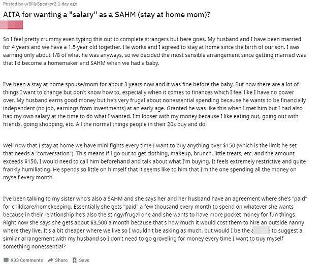 “Sounds like you’re a bored stay at home mother that wants to spend money on yourself because you can. Do you spend $900 a month on yourself? That’s a lot of freaking money and sounds like he has you on a leash for a reason because you’d spend every cent you could,” one person wrote.