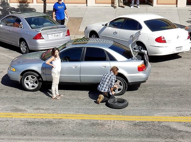 A homeless man was caught on camera changing a random woman’s flat tire in the middle of the day when no one else would stop and help.
