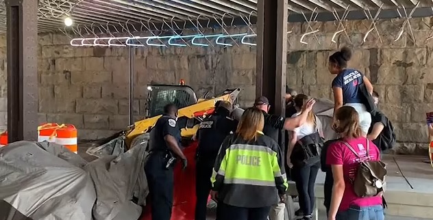 Though the incident caused the clearing of the encampment under the overpass to be halted for a day, the operations resumed on Tuesday.