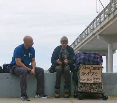 He is sitting with a person who has colon cancer and is asking for help. He also has a dog he calls Crazy Girl.