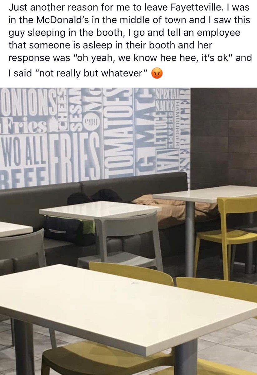 “I was in the McDonald’s in the middle of town and I saw this guy sleeping in the booth, I got and tell an employee that someone is asleep in their booth and her response was ‘oh yeah, we know hee hee, it’s ok’ and I said, ‘not really but whatever.’”