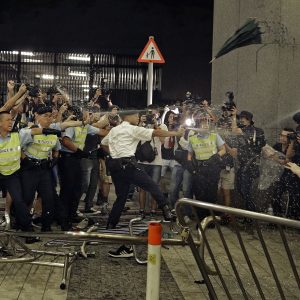 The protesters chanted such mantras as: “Liberate Hong Kong, revolution of our times.” Others chanted “Hong Kong independence, the only way out,” and others flew blue, pro-independence flags.
