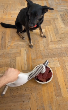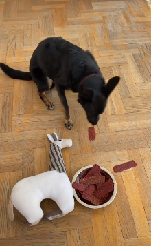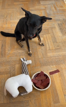 At the start of the video, we can see the camera being focused on the dog which is casually chilling by some treats.