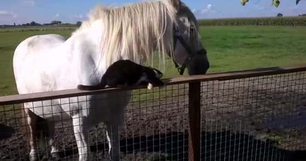 The video is oddly satisfying and intriguing at the same time. It is actually hard to believe that a horse and a cat can be friends but this video shows they actually can.