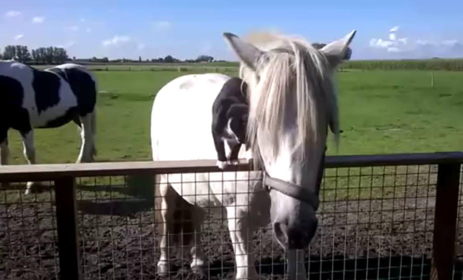 The video shows a horse tied to his post, standing, with his head equal to the railing while a cat rubs her face with the horse’s and plays with him as though they are childhood buddies.
