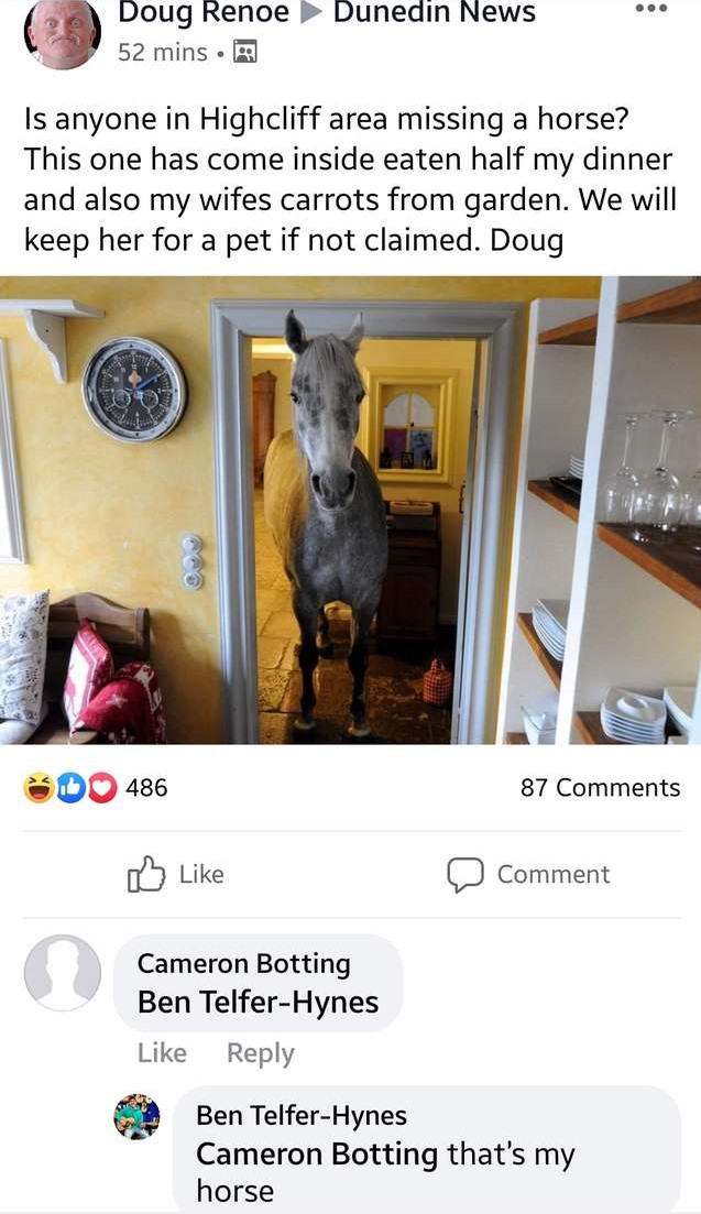 “Is anyone in Highcliff area missing a horse” Doug wrote in his Facebook post.