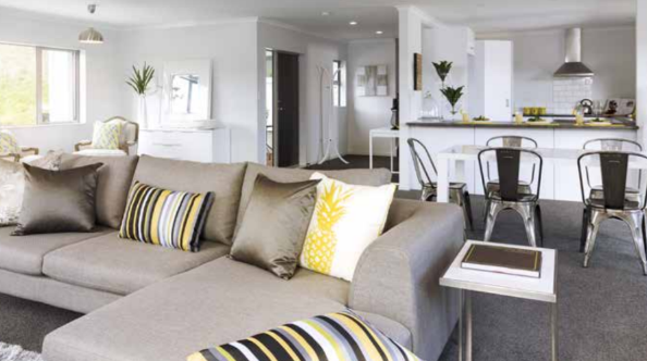 The home has fittings of COLORSTEEL roofing, Kaboodle kitchens, Mitsubishi heat pumps, Stein showers, Omega kitchen appliances, and Sengled security.