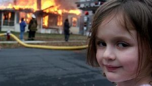 This meme has a cute little girl smiling in the photo despite the house fire in the background.