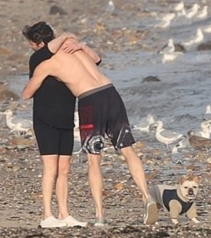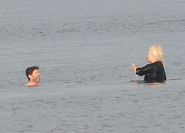 Following the warm embrace, the couple jumped into the cold water and splashed around before emerging to dry themselves and take off.
