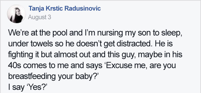 A photographer from Las Vegas, Tanja Krstic Radusinovic faced the same situation when a man who appeared to be in his 40s tried to shame her for breastfeeding in public. The man approached Tanja when she was breastfeeding her 9-month-old son at a pool.