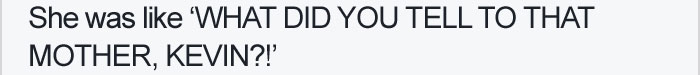 The woman said: “What did you tell to that mother, Kevin? What the f*ck, Kevin?! I had no idea I raised you like that, Kevin! I am not talking to you until you apologize! I breastfed you until you were 18 f*cking months, Kevin!”