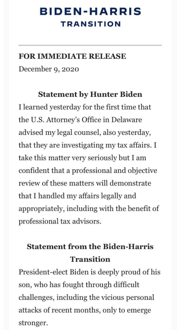 Along with Hunter’s personal statement, the team also shared an accompanying statement from the Biden-Harris Transition.