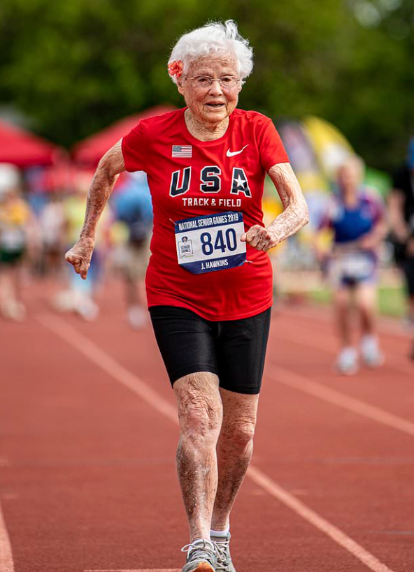 Hurricane’ Hawkins has banged down the wall and secured the title of the oldest woman to run for a 50 and 100-meter dash on the American ground at the National Senior Games organized in New Mexico.