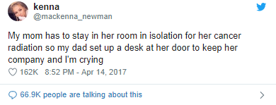Unfortunately, Mackenna Newman’s mother suffers from cancer which we know is the most dangerous disease. She shared a picture of her father sitting outside her mother’s room with a table placed because she had to be in isolation.