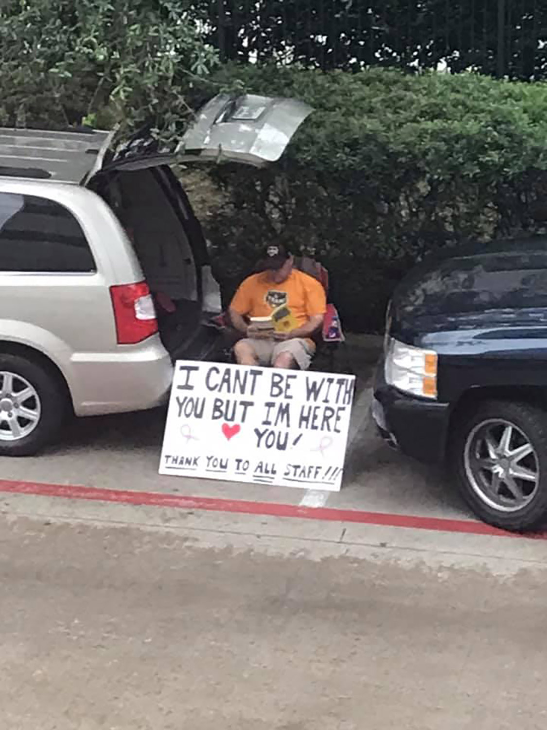 When Kelly looked out of the window, she found her husband sitting beside his van displaying a poster that said: “I can’t be with you but I’m here.”