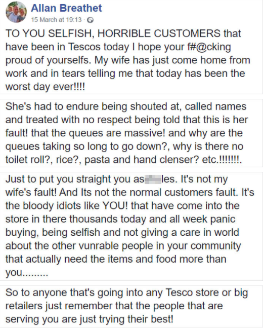 Allan was really fed up with the selfishness of the customers amid the pandemic and penned down a strong Facebook post highlighting why one should remain a decent human being.