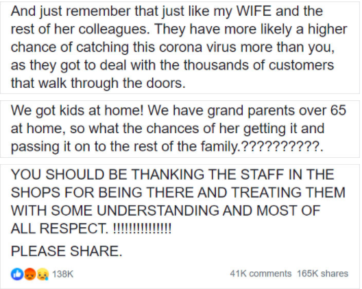This prompted Allan to post the rant on his Facebook, which received over 165,000 shares. All Allan wants is people to be kind while they are shopping instead of calling names, shouting, and not treating the workers with respect.