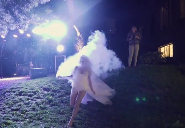 At the beginning of the video, the wife is seen jumping through a cloud of smoke before making her way onto a nearby patch of grass in her white wedding dress.