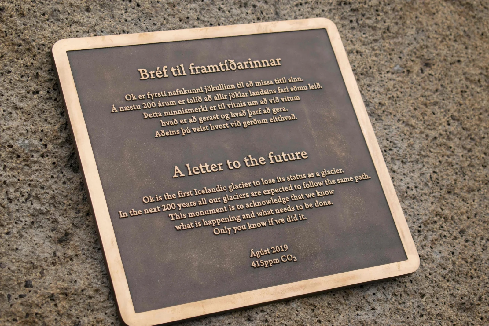 The group installed a plaque at the site of the glacier to memorialize the frozen body. The plaque carried a powerful message to the future in both English and Icelandic languages.