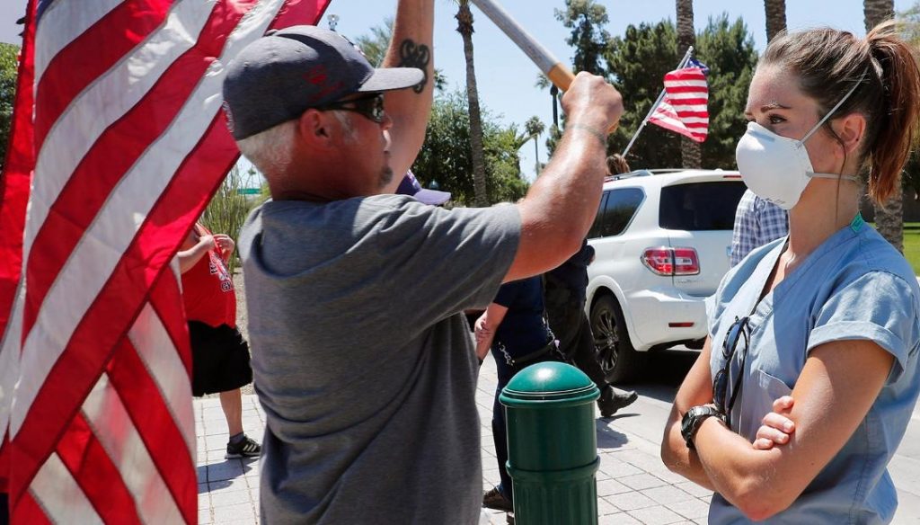 The nurses stood against a 1,000 protesters who gathered for the “Patriot’s Day Rally”. Leander emphasized that she did not have any political motives. She said that nurses were heeding scientific evidence, and expressed her hope that everyone do the same in the fight against the virus.