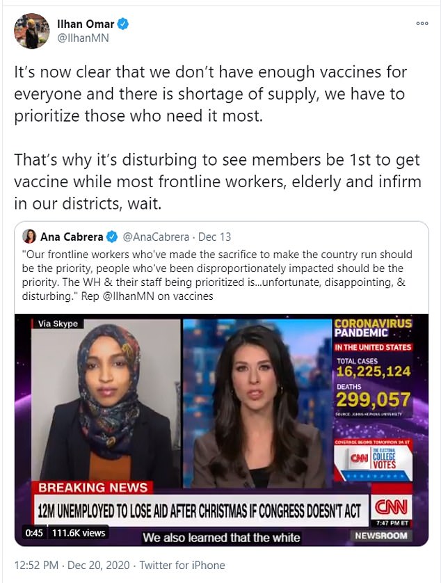 Rep Ilhan Omar slammed her fellow lawmakers for getting Pfizer vaccine ahead of the elderly and frontline workers.