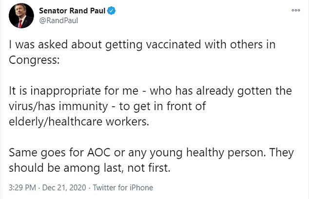 Sen Rand Paul, who tested positive for coronavirus in March, said: “I was asked about getting vaccinated with others in Congress: It is inappropriate for me – who has already gotten the virus/has immunity – to get in front of elderly/healthcare workers.”