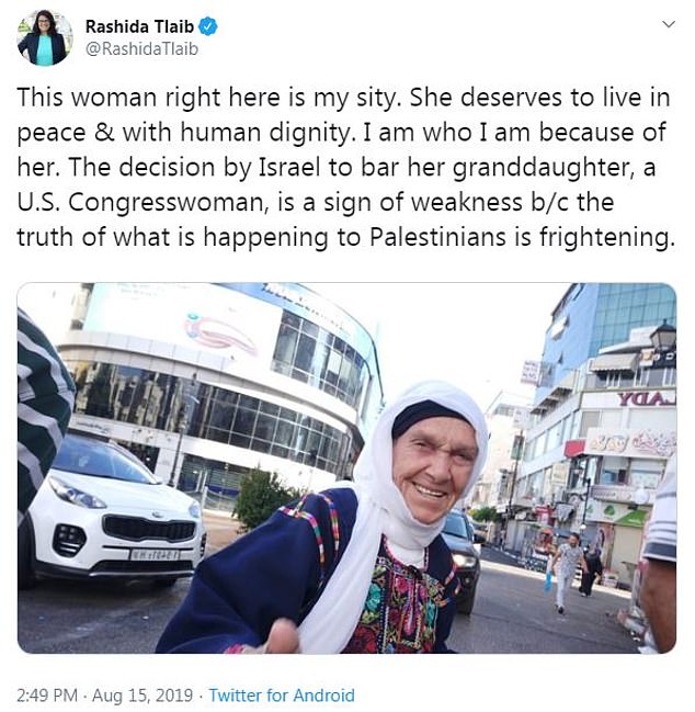 Meanwhile, Tlaib posted a photo of her grandmother Muftia Tlaib on Twitter, and said Israel’s decision to ‘bar her granddaughter’ from the country was a ‘sign of weakness.’