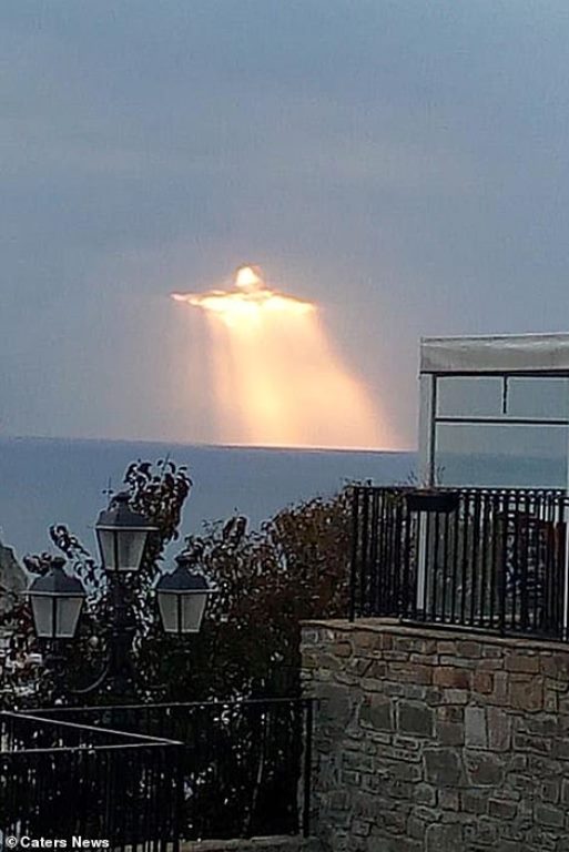The unusual light seems to show an image of Jesus Christ as it burst above the Tyrrhenian Sea.