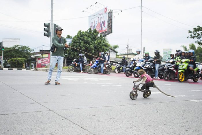 “Once trained they are paraded at traffic lights and busy areas, where their owners ask for money after each performance.”