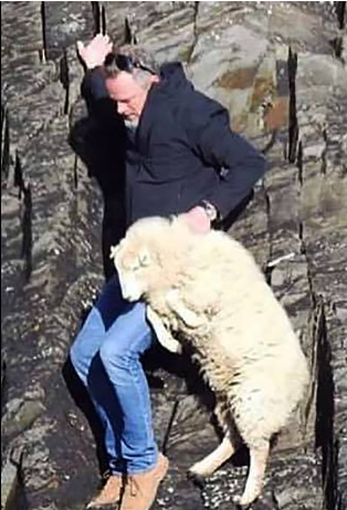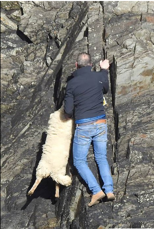 The man has rescued a sheep which initially lost the footing on the cliff top and ended up tumbling down to the rock face right above the sea level.