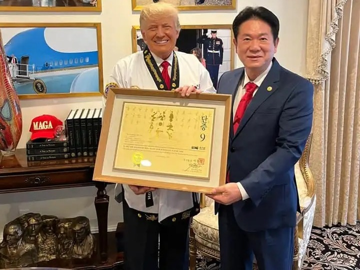 In that particular piece of art, you can clearly see a picture of Donald Trump beaming with a wide smile as he poses up for a photo with the honorary black belt from the World Taekwondo headquarters.
