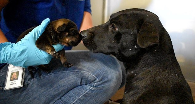 “Her demeanor is just as sweet with people as it is with her puppies and she is an excellent, attentive mother,” the AHS wrote.