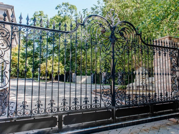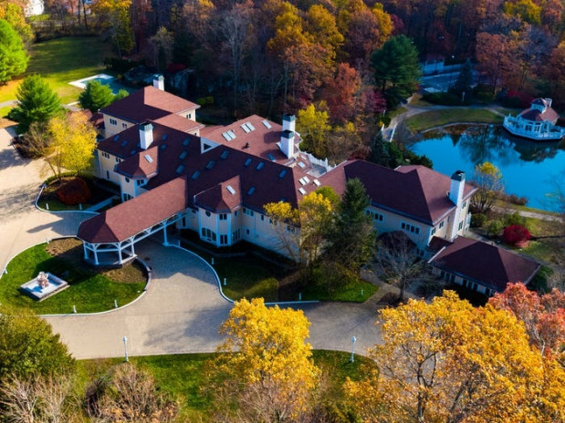 The 50,000-square-foot property boasts 52 rooms, including 21 bedrooms, multiple game rooms, and two pools. The entrance is marked with a stately front gate and a lion statue.