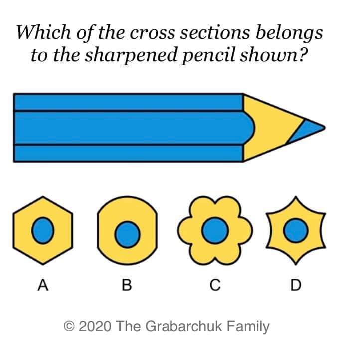 Which of the following cross-sections mentioned in the options actually belongs to this sharpened pencil that’s present below! Sounds easy right, but wait, if you take a closer look, you just might notice how each answer’s shape is not only different from one another but also quite different from the pencil itself.
